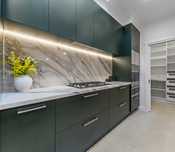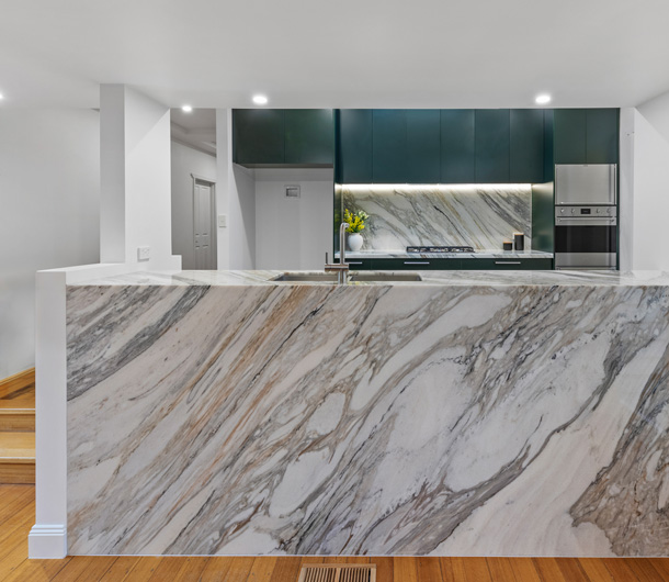 Colorado Gold Extra marble features a white background with thick and thin veins of beige, light grey, green-grey to blue-grey. This gorgeous material is versatile and is suitable for interior and exterior projects. Because of a glossy surface that reflects light, it can make any space look brighter.