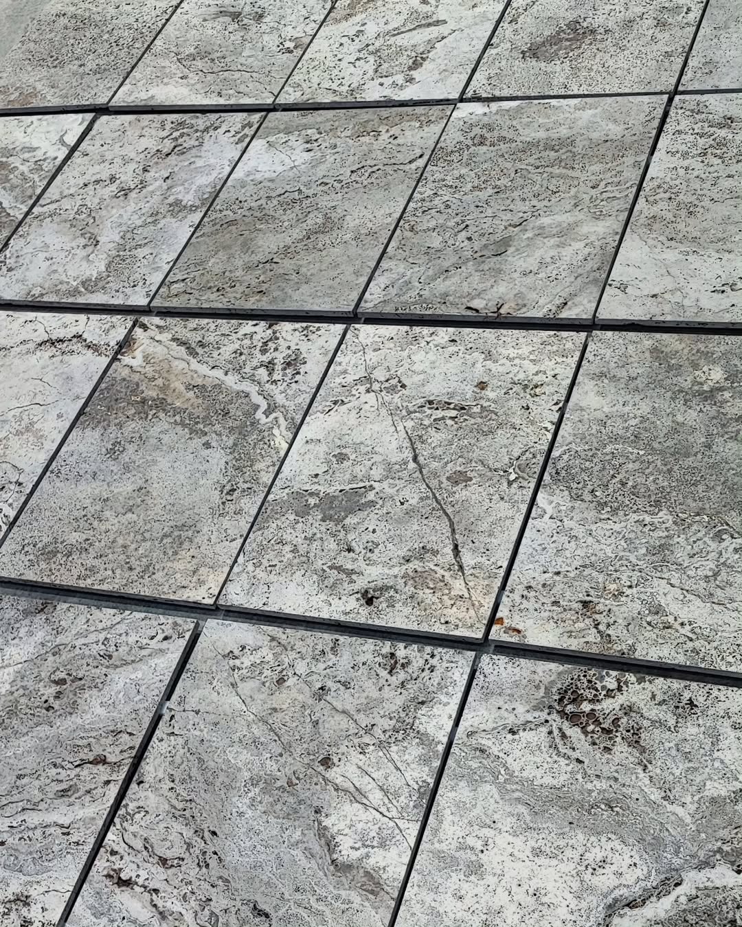 Silver Travertine has the same characteristics as classic travertine but with metalic silver and grey tones. Our special silver travertine contain beige undertones, however it is predominantly grey. Silver Travertine tumbled tiles and pavers are suitable for outdoor use, as pavers predominantly around pools, patios, alferesco and BBQ areas.